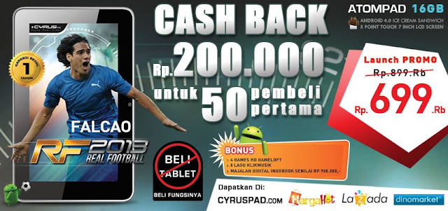 Dapatkan Cash Back Rp.200.000 untuk 50 Pembeli Pertama Cyrus AtomPad 16GB dari Rp.899.000 menjadi Rp.699.000. Dapatkan di cyruspad, HargaHot, Lazada, dan Dinomarket.